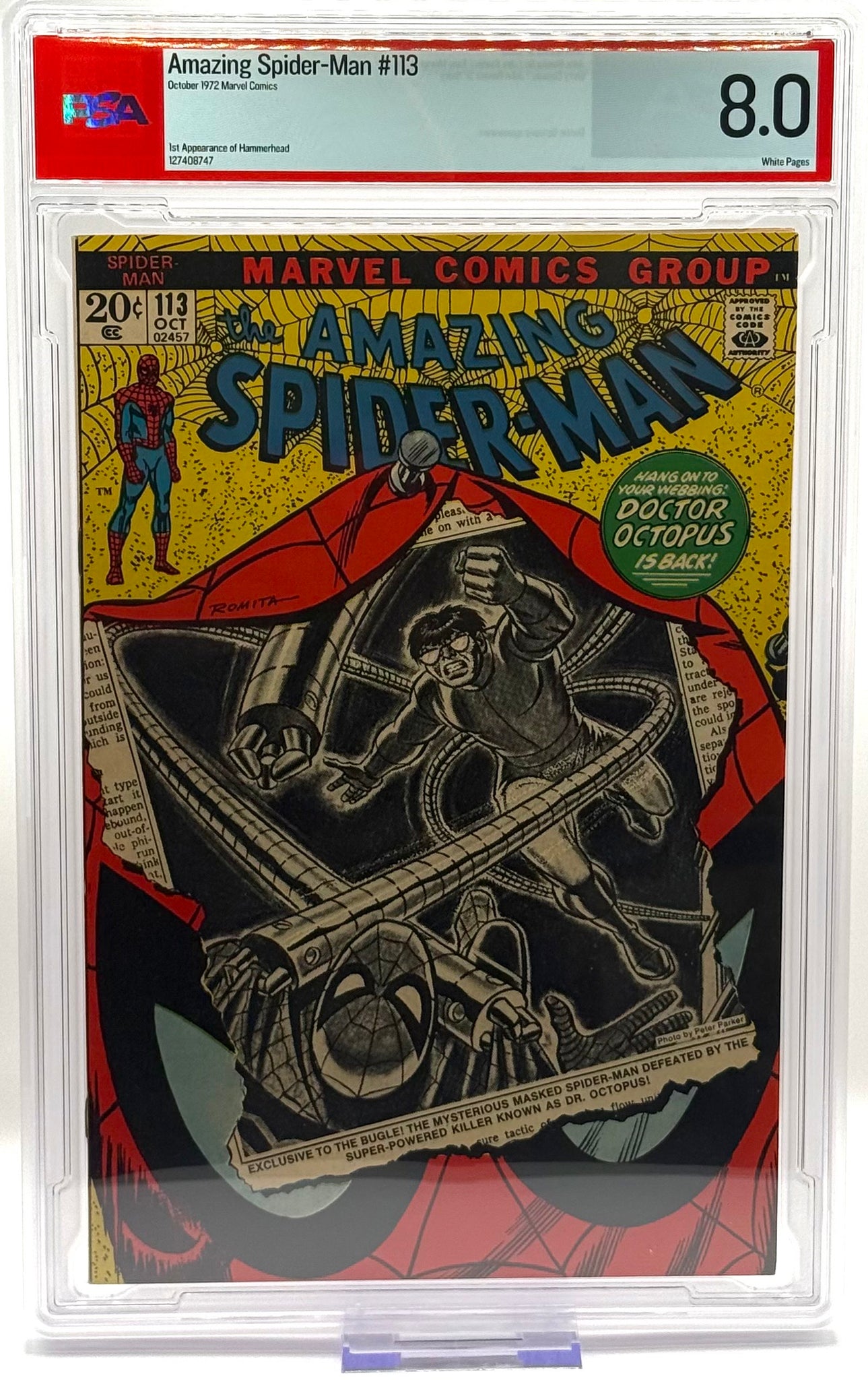 First appearance of Hammerhead in "They Call the Doctor...Octopus!" Part 1 of 3. Script by Gerry Conway. Art by Jim Starlin (breakdowns), John Romita (finishes), and Tony Mortellaro (backgrounds). Cover by John Romita. What a shocking turn of events! The web-slinger was looking for his Aunt May...but he found Doc Ock instead! As expected, a free-for-all quickly commences between the long-time adversaries. But due to sharp pains in his stomach, Spider-Man has to retreat. However not before Dr. Octopus rips off his mask! When Peter returns to his apartment, his roommate calls for a doctor. And to everybody's surprise, Peter is diagnosed with an ulcer! Meanwhile, Otto Octavius resumes his plan to take over the New York underworld. But there's a new crime boss in town who also wants to run New York's rackets! And his name is Hammerhead! Cameo appearances by Randy Robertson, Martha Robertson, Joe Robertson, J. Jonah Jameson, Gwen Stacy, Harry Osborn, Betty Brant, and Ned Leeds. (Notes: John Romita is credited as a co-plotter. This story was reprinted in Marvel Tales #92.) 36 pages. Cover price $0.20.