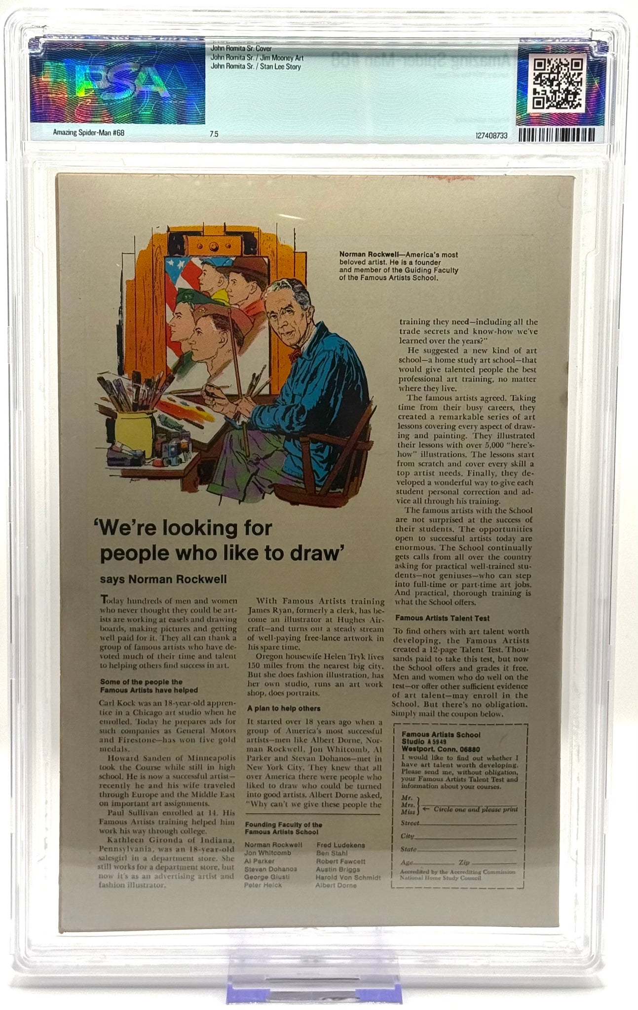 "Crisis on the Campus!" Part 1 of 3. Plot by John Romita. Script by Stan Lee. Art by John Romita (layouts) and Jim Mooney (finishes). Cover by John Romita. The students are restless on the Empire State University campus. The old exhibit hall is being repurposed into an alumni center instead of a low-rent dormitory. And the student body -- including Randy Robertson -- is not happy about it. In the meantime before the exhibit hall closes, it will display one final item: a petrified clay tablet. The priceless tablet is said to hold an ancient secret in its hieroglyphics. And a certain Big Apple crime boss wants the tablet very badly! When the Kingpin learns that student protestors are taking over the exhibit hall, he makes his move to steal the tablet! But the large crime lord doesn't know that Spider-Man's alter ego is a student at ESU. So, when the Kingpin storms the exhibit hall, the web-slinger is right behind him! Can the wall-crawler keep the students safe and the tablet secure...while clashing with the Kingpin? Cameo 36 pgs. appearances by Joe Robertson, J. Jonah Jameson, Gwen Stacy, Aunt May, and Anna Watson. (Note: This story was reprinted in Marvel Tales #51.) 32 pages. Cover price $0.12.
