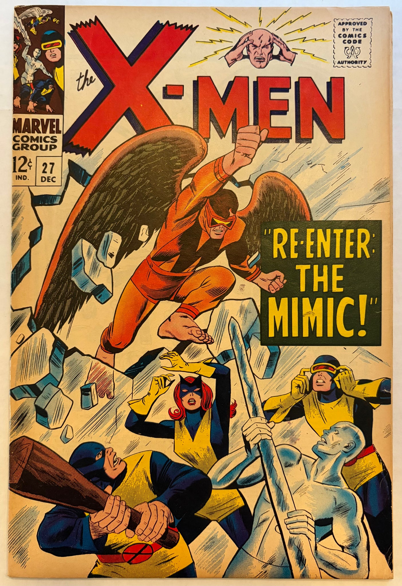 “Re-Enter: The Mimic!” (script by Roy Thomas, pencils by Werner Roth, inks by Dick Ayers): In the aftermath of being struck by Cyclops’ optic blast, Angel struggles to recover as the Mimic regains both his powers and memories. The X-Men clash with the Puppet Master, with cameo appearances by Spider-Man and the Fantastic Four.